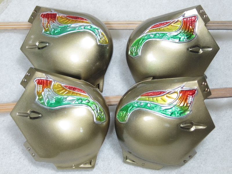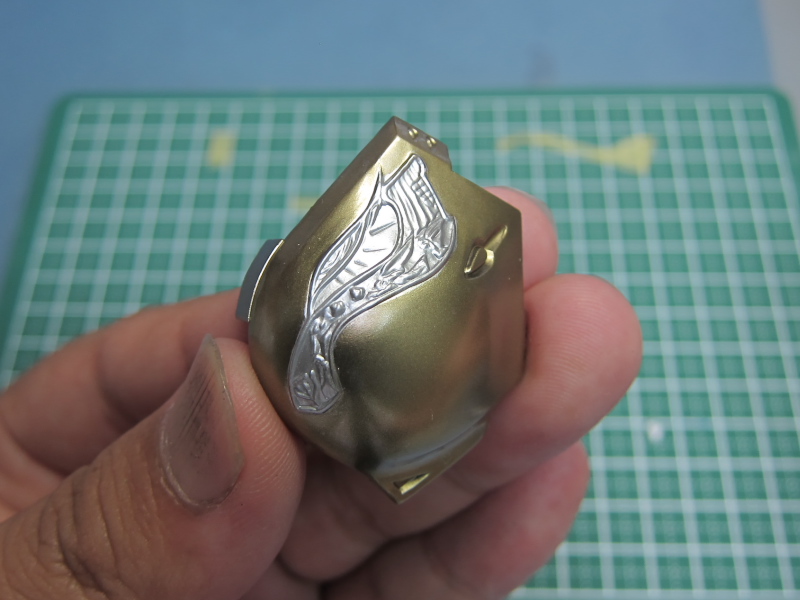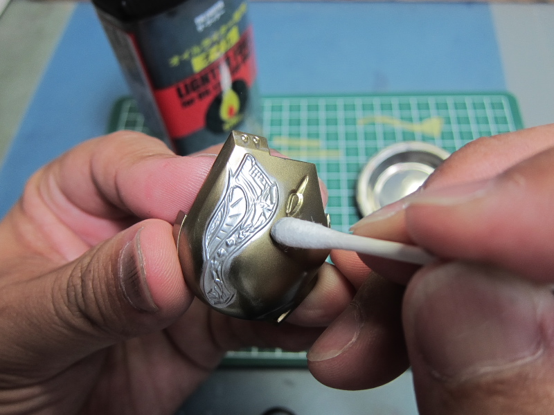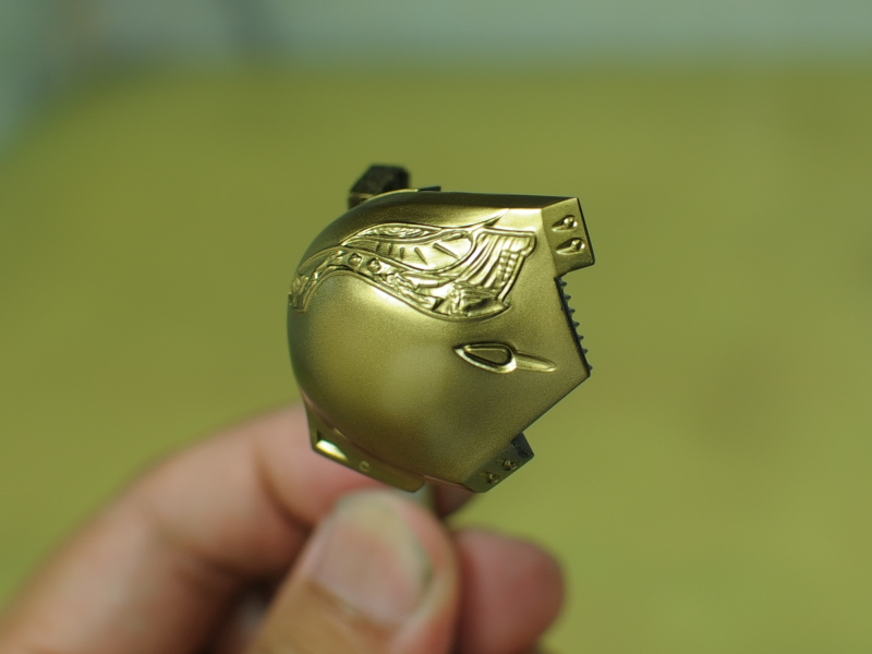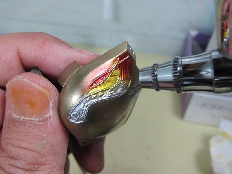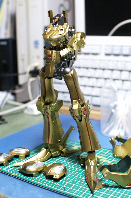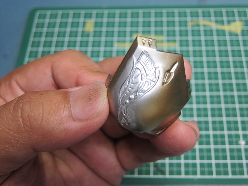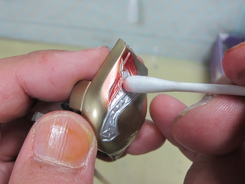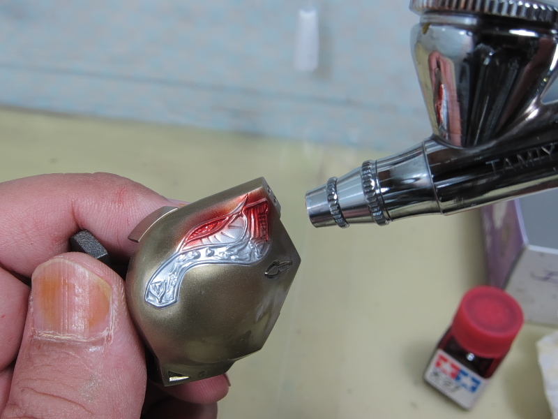 資料を見ると、七宝焼きのような艶、しかもレッドからグリーンへグラデーションが がかったような塗装と推測されます。 形状が細かいので、マスキングによる塗り分けなんて・・・ムリムリムリムリっ!! ここはラッカー系塗料とエナメル系塗料の特性を利用して塗り分けに挑戦します。 ラッカー系塗料でゴールドまで塗り上げた肩のパーツ。 細かい線が入った羽のような模様をグラデーションで塗り分けます。 まずはクリアーカラーの発色を良くする為に下地色として エナメル系のクロームシルバーを吹きます。 多少のはみ出しは気にせず艶が出るまできっちりと。 次にジッポーライター用オイルをしみ込ませた綿棒で はみ出た部分を慎重に拭き取っていきます。 いろいろ試しましたがこのオイルが一番綺麗に拭き取れます。 ハイ、綺麗に塗り分けができました。 エナメル系塗料はラッカー系塗料と混ざらないので このような事が可能です。 この後、ラッカー系のクリヤーで表面をコートします。 (ラッカー系塗料はエナメル系塗料を侵すので エナメルの上にラッカーの重ね塗りは出来ないと言われていますが、 エアブラシで薄く何回かに分けて吹けば大丈夫です。) クリアーが乾燥したら、エナメルのクリアーレッドを吹きます。 はみ出た部分を再びジッポーメンボーで修正。 ラッカーのクリアーを吹いてあるのでシルバーは残ります。 続けてエナメルのクリアーオレンジ、クリアーイエローを 色味を見ながら吹いていきます。 はみ出た部分を修正後、最後にクリアーグリーンを。 モールドの出っ張った部分を拭き取り、完成です。 ふぅぅ~っ、なんとかイメージ近くできました。 あともう少し、ガンバります・・・。 噂になっていましたが、ようやっとリア駆動のM-06がリリースされるようです。
