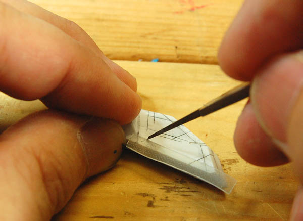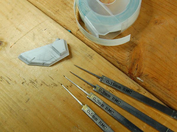 今日はやっぱりもろもろの用事でコムオフに行けなかったkotatuです。 コースオープンでかなり賑わった模様で、今シーズンは盛り上がる事必至です。 私も沸騰しそうな血を抑え切れません・・・。 なのでその熱い滾りはガンプラにぶつけようと思います(←おぃ) 前回予告した通り、スジ彫りによるパネルラインの表現をして見ます。 使う道具は↑コレ。 模型用のタガネとガイド用の透明なダイモテープ。 タガネは職人さんが一本一本鍛え上げた逸品。 もはや手放せない私の宝物です。 刃先が平らなので、同じ幅の深いスジ彫りができます。 0.15ミリから0.5ミリがあり、場所によって使い分けます。 透明なダイモテープをガイドにして、描いたライン上をカリカリ彫っていきます。 刃先がデリケートなので、最初は撫でるように、アタリが付いて来たら徐々に刃を立てて深く彫ります。 彫り上がった写真です。 スチールボールを埋め込む0.5ミリの孔も開けます。 だいぶカッコよくなったでしょ? 次回はこれに段落ちモールドとフィンを追加して見ようと思います。