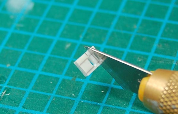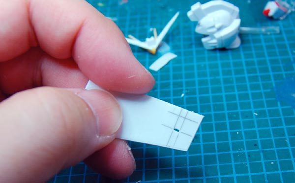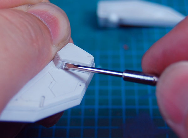 呼び方は人によって ○○一号二号 はまだいい方で 細い方の○○、太い方の○○とか しまいにゃ オデッセィ○○とか 佐門○○とか ほっとけぇ~って感じですな。 さて、前回に引き続き、いまだに腰アーマーを弄っております。 今回は段落ちモールドによるダクトの表現をやって見ます。 ダクト部分を四角に罫描き、その範囲を彫っていきます。 使っている道具はマイナスの精密ドライバーを研いだ自作のノミです。 撮影の都合上刃の先に指がありますが、 危険なので絶対刃の先には手や指を持ってこないようにしましょう。 彫りあがるとこんな感じ。一段低くなるので段落ちモールドと言うそうです。 で、これだけだと芸が無いので・・・ 0.2ミリのプラバンからフィンの形状を切り出して・・・ ダクト部分に追加してやるとこんな感じ。 最初に比べるとかなりメカニカルになりました。 腰アーマーはこれで大体終了。 次は頭部のディティールアップにかかります。 おばんでやす。