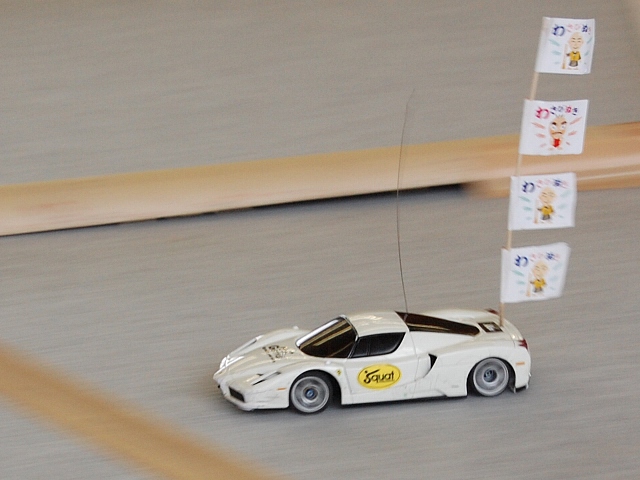 さ~て、先日は三浦電波模型さんのミニッツレースを楽しんできました。 戦績はミニkotatuと揃って前回と全く同じ! このまま親子でCメインにずっと居座りそうな勢いです・・・。コソ練とかやったんだけどな~!! ってゆーか、全く走らせていない人がいきなり来て優勝ってスゴくね? ってゆーか、皆さんレベル高くね? そんな訳で、ホーム以外のレースはとっても刺激になるので皆さんもどんどん遠征(?)しましょう。 少し真面目に話しをするならば。 三浦電波模型さんのサーキットは、京商製の路面を使っているのでとてもグリップが高くなっています。 普通、グリップが高ければドライビングは楽になりますが、ここの路面はタイヤが食いすぎてラフなステアリングワークではハイサイドで転がります。 そう言った意味では、低グリップの路面よりも難しいかもしれません。 スロットルをいきなり戻してがばっとステアリングを切り、リアをブレイク気味に回り込むような走法は通用しません。今回の優勝者さんも言っていたのですが、とにかく操作はスムーズに、かつ綺麗な円を描く様な走らせ方が必要になります。実際、その人の走りは全く速く見えず、タイムを見て初めて驚くような走りでした。 つまり、遅く見えてもコーナーでスピードが殺されず、かつ急激な荷重変化の少ないベストラインに載せる走りだったのです。 それはまさにずっと目標としていた走らせ方。 是非弟子入りしたいものです(笑)。