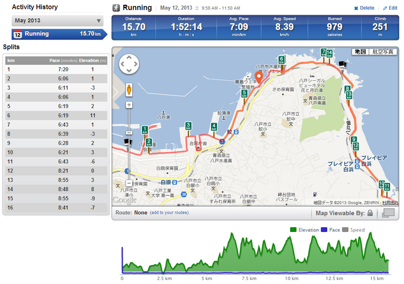 直前の練習でも10キロ走れなかったからね・・・ 結果はタイトルの通り。 15キロを過ぎた所でひざの痛みで足が動かなくなり、そのまま後ろから迫ってきた回収バスに収容されました(泣笑)。 なので新聞で記録のページを見てもkotatuは載っていませんので探さないように(滝汗)。 ・・・でも楽しかったです。 今日のビールは最高の味でした。 周りからはなんでハーフなの?5キロ、せめて10キロにしときなよ、とはよく言われましたが、どうしてもあの道をこの脚で走ってみたい理由がありました。 蕪島から葦毛崎を過ぎて、白浜を通り、種差に至る通称うみねこライン。 幼いころ、両親に連れられて行った海へ続く道。 友達と自転車をパンクさせながらたどり着いた海へ続く道。 免許をもらい、バイクで初めて行った海へ続く道。 最初の車、今のカミさんを助手席に乗せて行った海へ続く道。 時代と周りが変わっても、そこにいつも変わらずある海へ続く道。 今度はこの脚で走りたかったんですね。 うみねこマラソンで、このコースを通るのはハーフだけ。 往復走れたので、今とってもシアワセな気分に浸っております。 次回は完走したいな・・・・。 たどり着けなかったゴール。 子供達も多数参加。 お仕事お疲れ様っス!いつもお世話になっています! はやぶさも走る! 親子で仮装出場。来年やってみる?と言われる・・・ iPhoneで取った走行記録。 1キロを6分45秒のペースで走る予定が、周りに引っ張られスタートから飛ばし過ぎ。 後半バテて折り返し地点を過ぎてからは走ってんだか歩いてんだか分らないペース・・・。 最後に、大会を運営したスタッフの皆様、ボランティアの方々、声援をくれた沿道の皆さん、本当にありがとうございました。 すばらしい大会でした。 来年もよろしくです! 空きっ腹を抱えて入った二件目のお店。