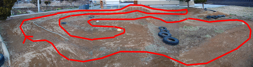 季節外れの雪と寒さで凹みモードのkotatuです。 やっぱり寒いのだけは苦手です!タンスの奥から再びモモヒキカムバックです!! しかし着実に外ラジの季節は近づいています。今月の22日はオフロードレースなので、コムカイ模型さんのオフロードサーキットを下見してきました。 路面は去年入れた土がまだフカフカの状態ですが、レースまでにはもう少し落ち着きそうです。テーブルトップのアプローチ部分がちょっと荒れているので手直しして欲しいところ。 おぉぉ!すでに何台も走行させた形跡が・・・。 レイアウトがわかりにくいので、赤いラインを入れてみました。 う~ん、ますます判り難い・・・(汗)。 コムカイさんに確認したところ、もう走らせても良いですとのことでしたが、今日はクルマ準備してませんでした。残念。 どもー!更新がすっかり週一ペースに落ちてますが相変わらず頭の中はラジコンとガンプラの事で一杯のkotatuです!