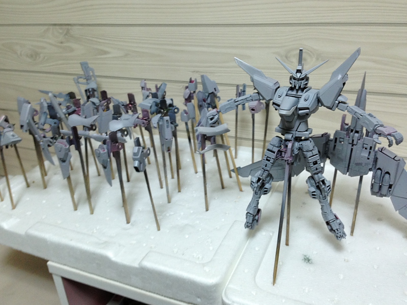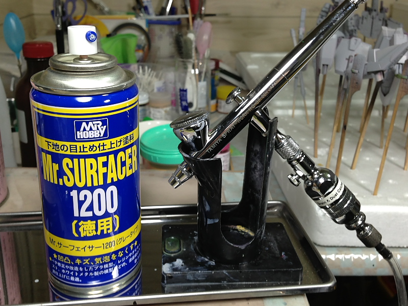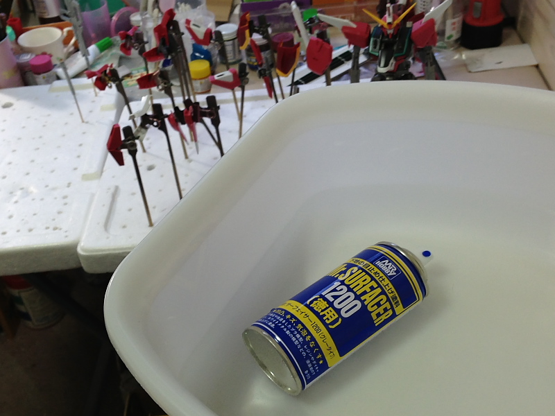 買ったはいいけど作っていないプラモデル、別名”積プラ”。 最近老眼も進んでるし、このままじゃ完成させないまま一生が終わっちまう! 楽しくてやっているとはいえ。 一つの模型をきちんと塗装して完成まで持って行くのはかなりの労力(特にガンプラ)。 でもやり方を変えればも少しなんとかなるんじゃな~い? 今までだと。 一度素組して状態を確認した後、全バラして下地処理と洗浄をしていました。 これを、塗装の時困らない最低限のバラしに抑えてみます。 良かった点は。 ・細かいパーツが出ないので紛失するリスクが減りました。 ・サフ吹きが楽だし、使う量も少なくて済みました。 ・時間短縮! 悪かった点は。 ・細かい所へサフが回りにくい。 くらいかな・・・ 労力削減の為、缶スプレータイプのサフを用意します。 寒いと綺麗に霧にならないので、入浴(笑)させます。 缶スプレーだけだと細かい所が塗れないので、エアブラシも併用。 MGクラスで2時間程度でサフ吹き終了。 全バラしてた時は丸一日以上かかったものです。 パーツを立てる場所もこの4倍以上使いました。 サフを吹いて傷やヒケが分りやすくなったので、この後下地処理に入ります・・・。 皆様明けましておめでとうございます。